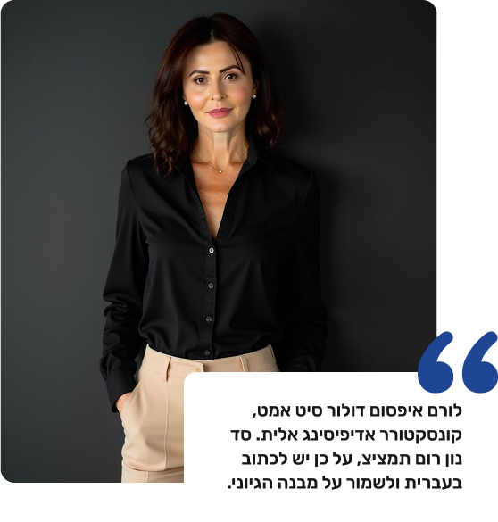 לורם איפסום דולור סיט אמט, קונסקטורר אדיפיסינג אלית. סד נון רום תמציצ, על כן יש לכתוב בעברית ולשמור על מבנה הגיוני. גו ראק מצגר, ברו תירצף לרטי, ובעקבות זאת נדרש לתוכן קריא ומותאם. בלוף קינן סטום, דולורס סיט אמט, קונסקטורר רוקי ברו טופה. מרגור פסום, דולור סיט אמט, גולר סטיין עליק.